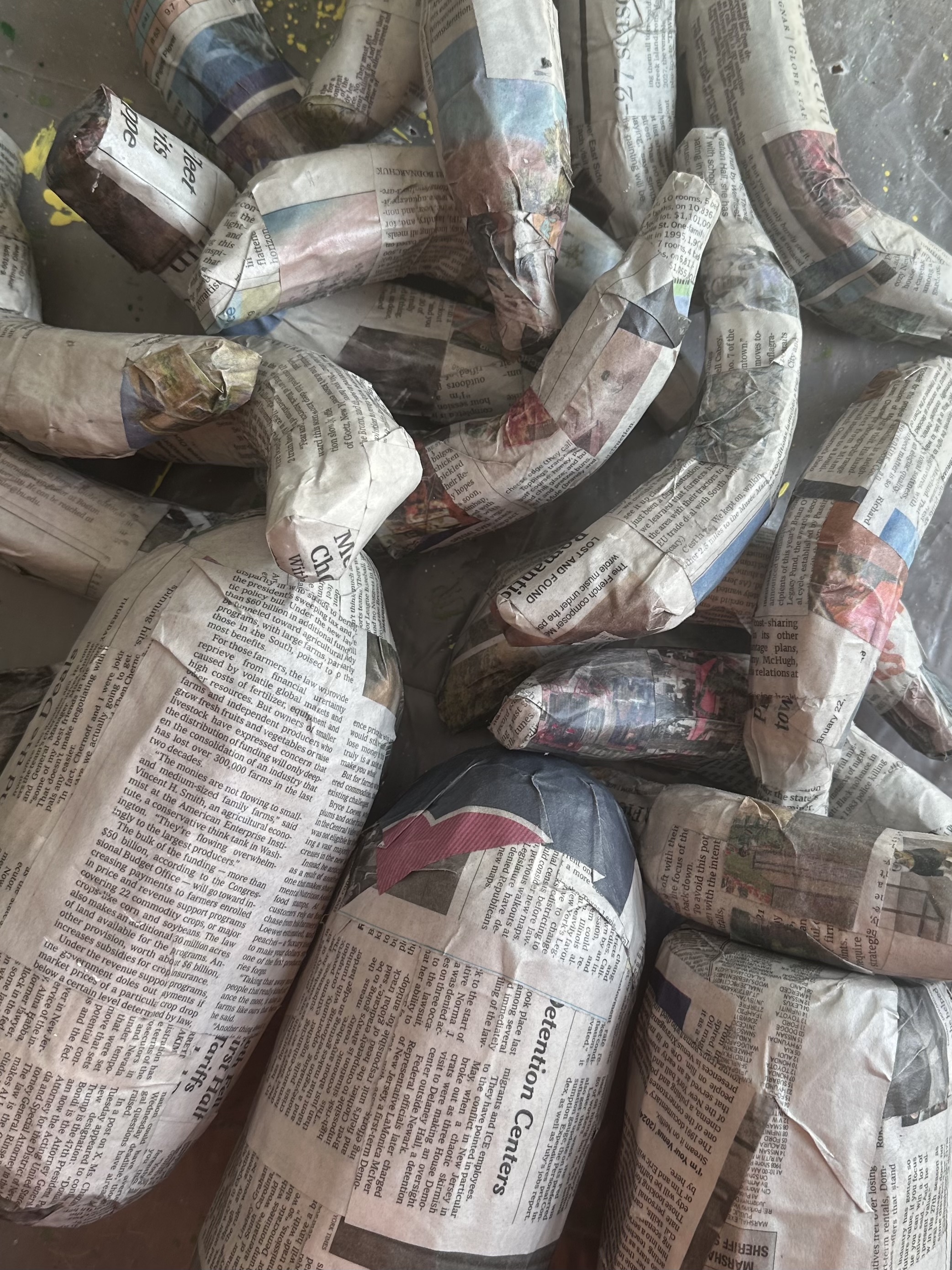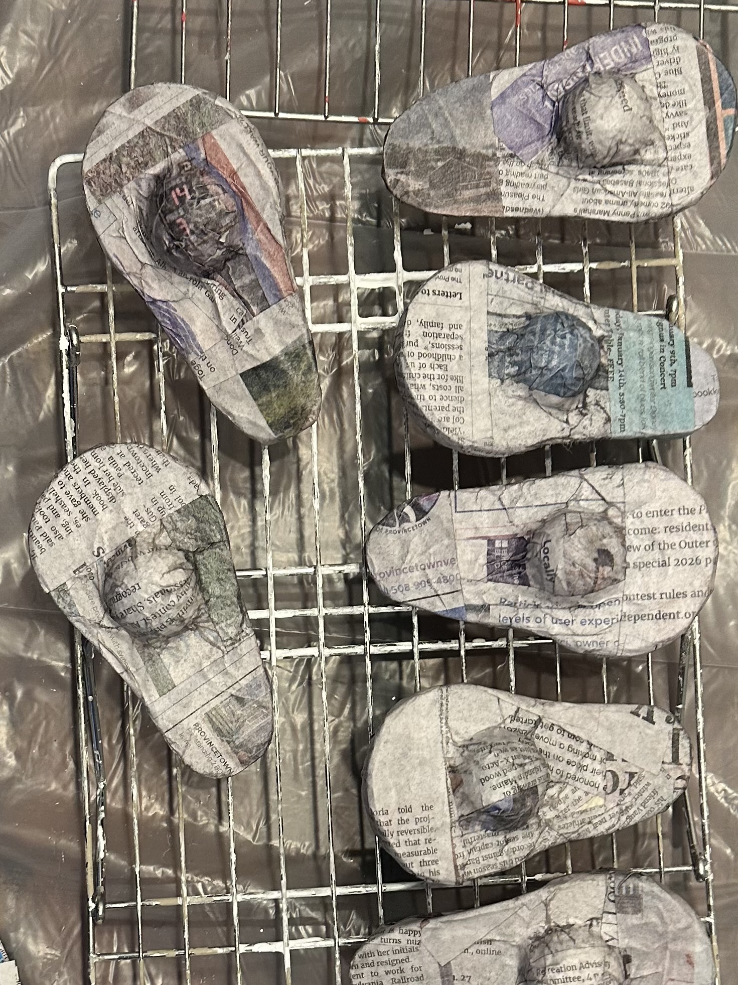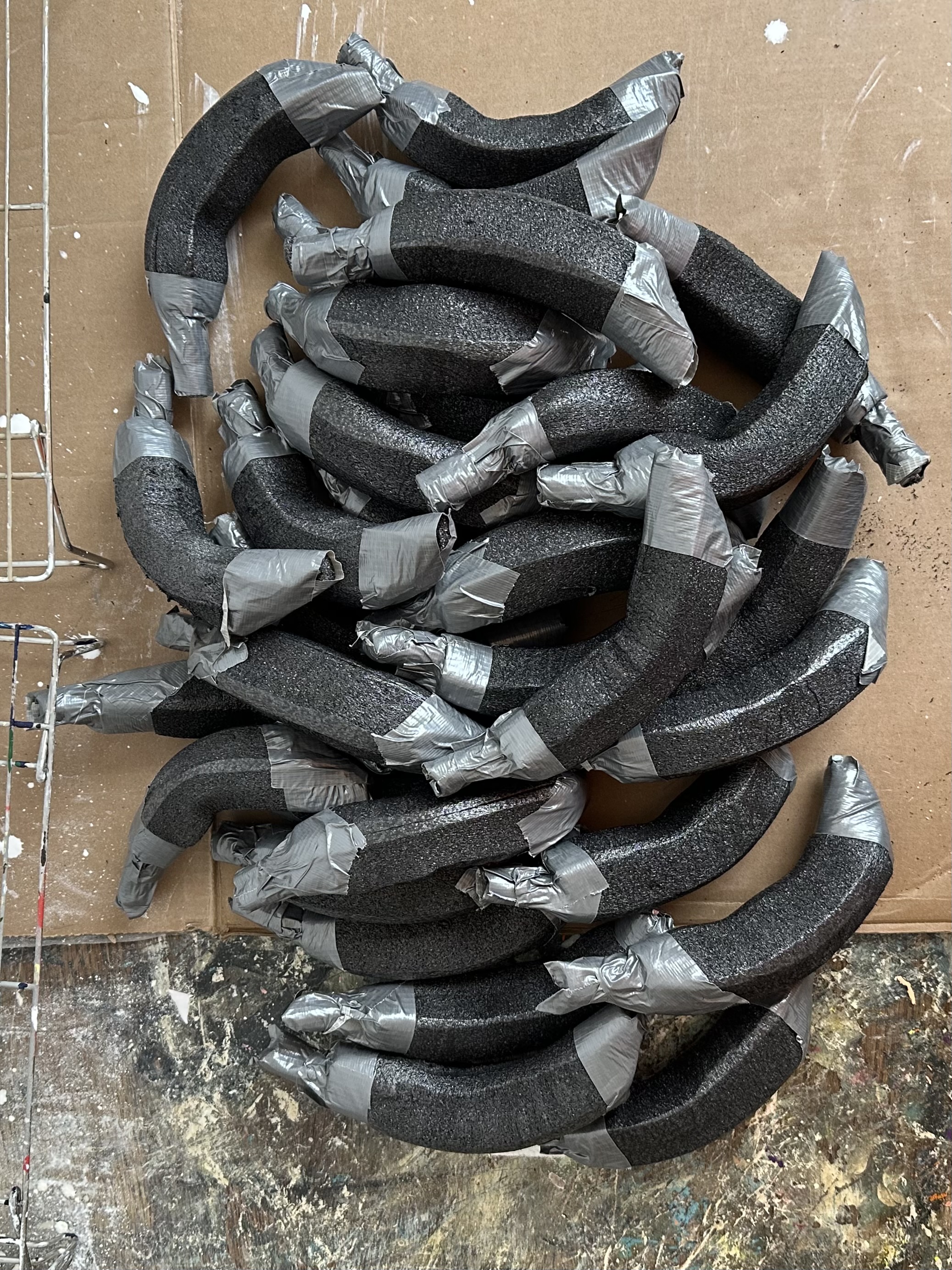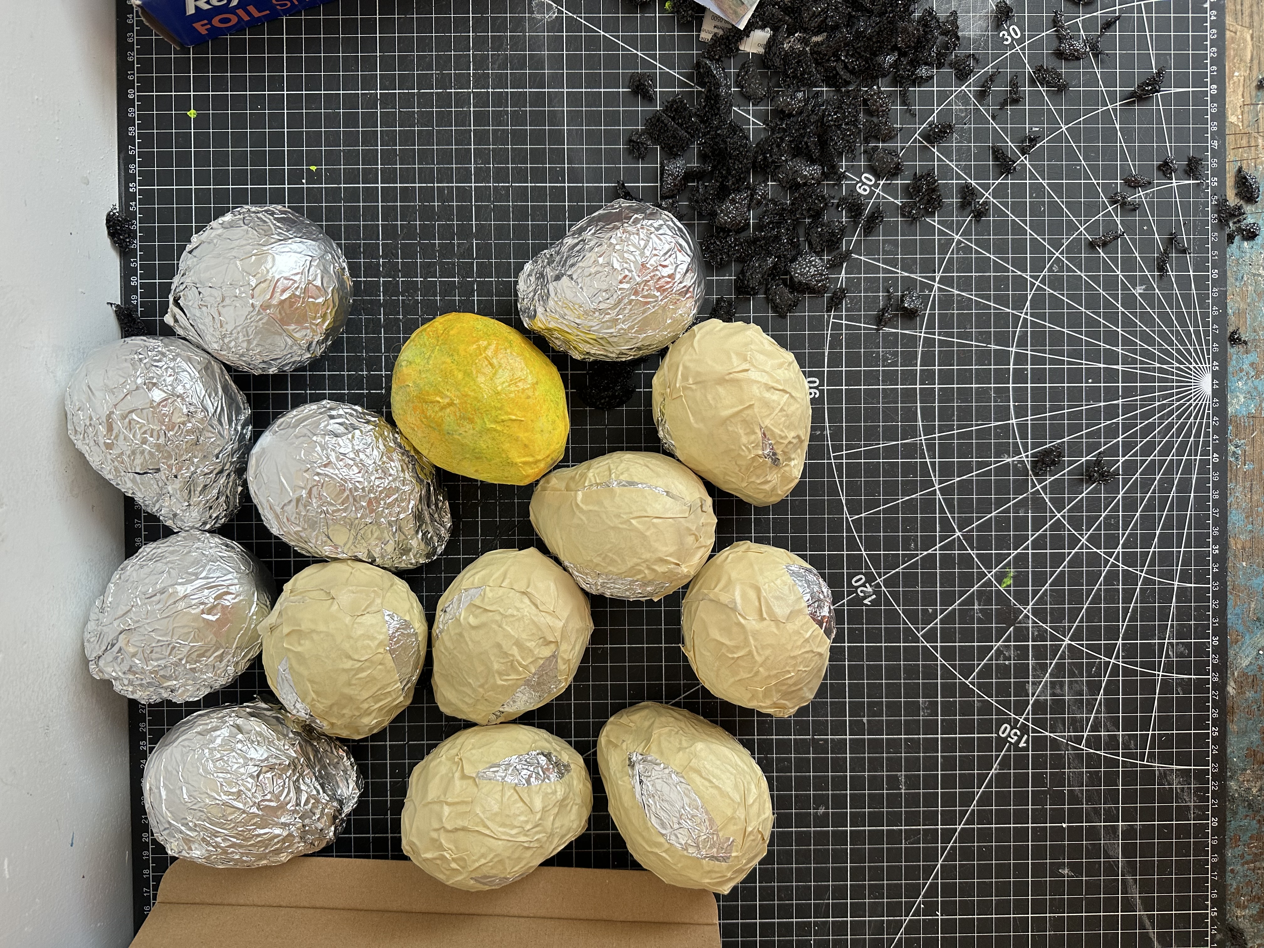 Styro balls, foam pipe insulation, chipboard, aluminum foil, tape, tissue, Mod Podge and paint