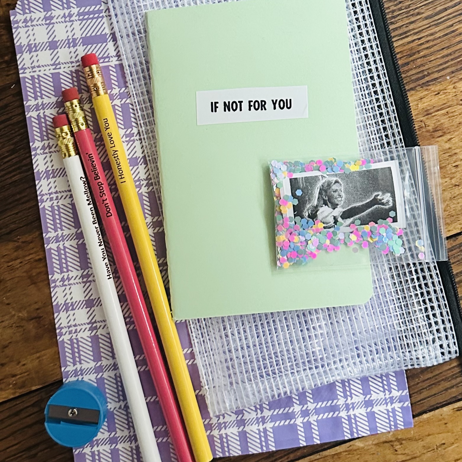 3 printed pencils with ONJ song titles, blank notebook, sharpener, sticker and glitter, all in a pencil pouch